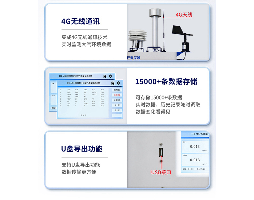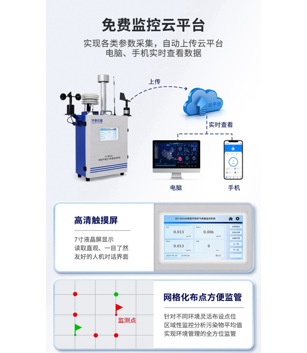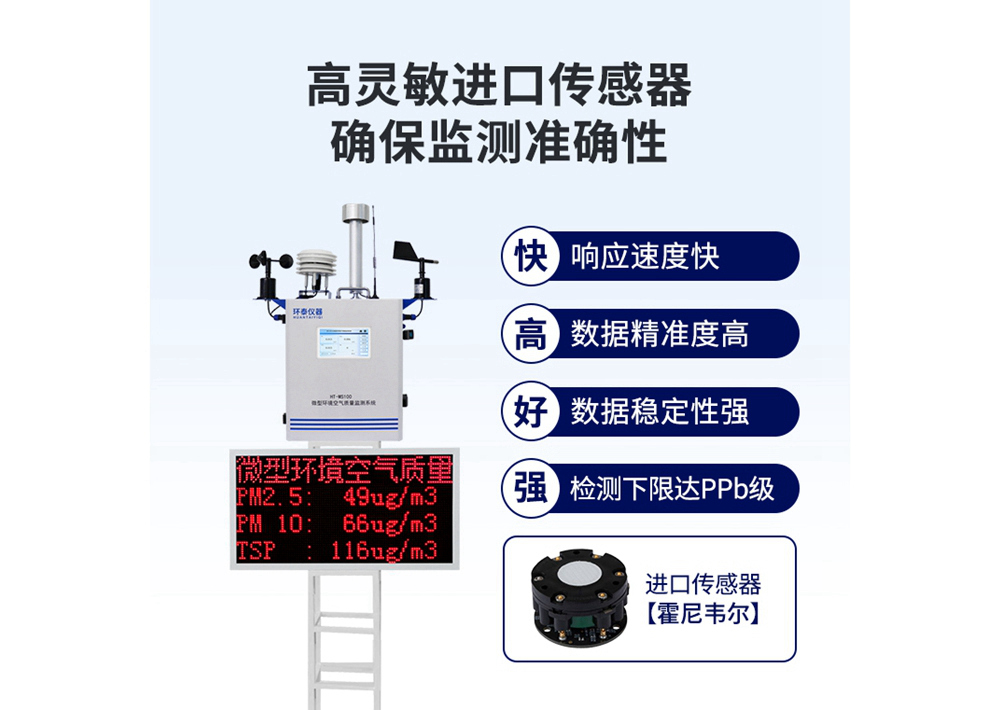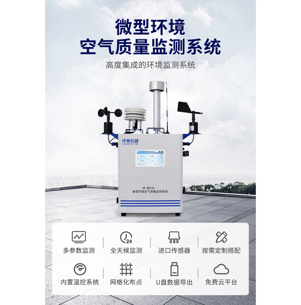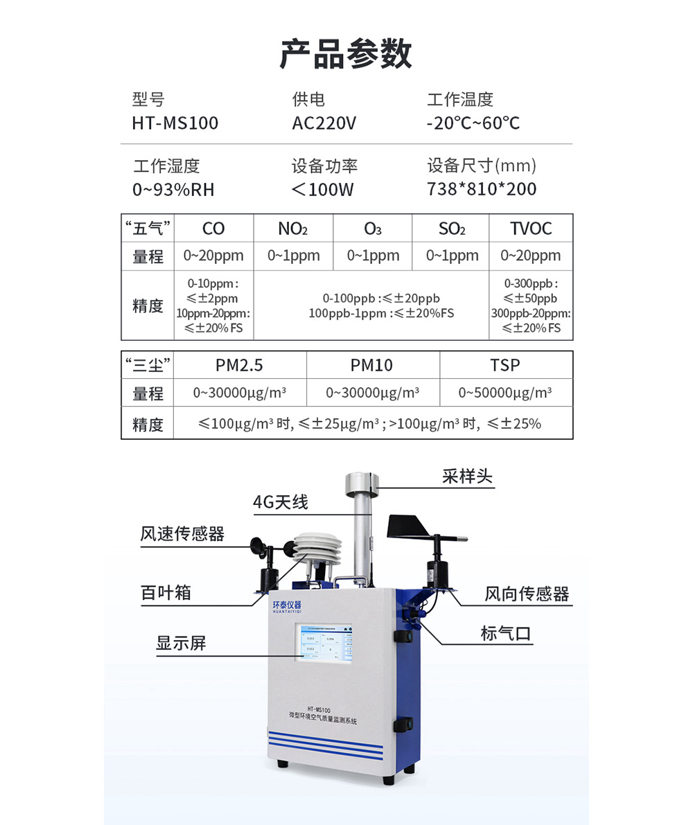 HT-MS100 工地微型环境空气质量监测系统可以全天候、连续、自动地监测环境空气气态污染物(S0₂、NO₂、CO、O₃、TVOC)和环境空气颗粒物(PM2.5、PM10、TSP) 等的实时变化情况,迅速、准确的收集、处理监测数据,实现区域空气质量的在线自动监测。