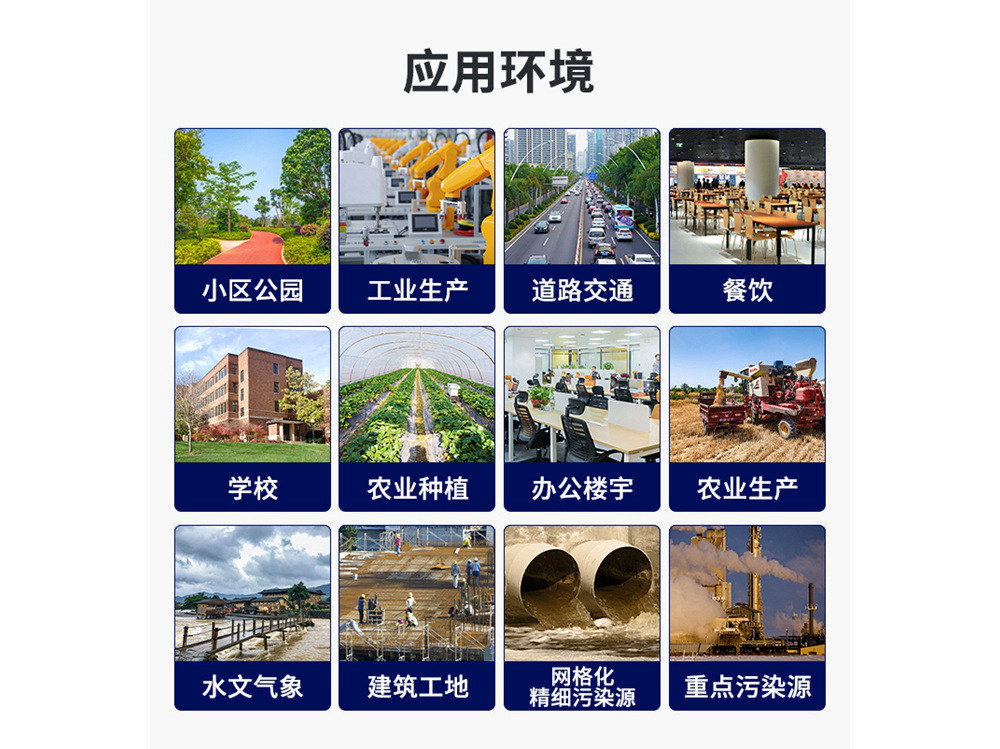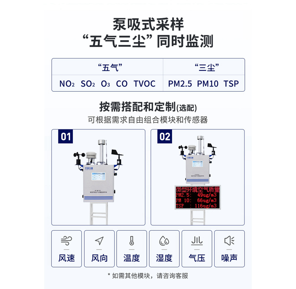 可测粉尘/气体:PM2.5/PM10/TSP/S0₂/NO₂/CO/O₃/TVOC等