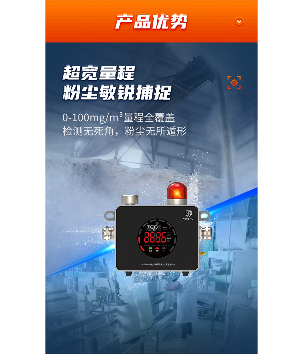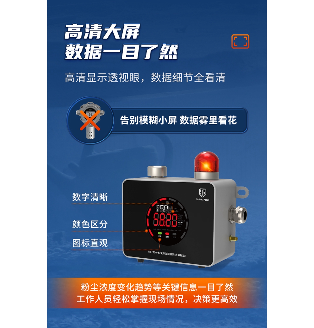 YR-F110A粉尘浓度测量仪采用激光散射原理,直读空气中粉尘颗粒物质量浓度。配备采样头、检测装置、单片机系统及风机抽气系统,具备携带方便、测量快速准确、灵敏度高、性能稳定等特点。支持RS485总线和4-20mA输出,抗干扰强,适于远传。采用壁挂安装,配合控制器实现数据显示与输出控制。